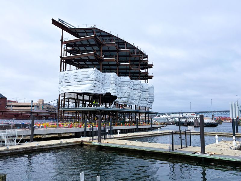 “Big things are happening at the National Coast Guard Museum construction site in New London, CT. Significant progress is underway inside the structural steel frame as AZ CORP and their subcontractors continue installing key infrastructure, including conduit, piping hangers, and roof drains. The next visible milestone will be the installation of a temporary weather enclosure around the first three floors. With below-average temperatures, this wrap allows crews to safely complete temperature-sensitive work like placing concrete on elevated floor decks and applying spray-on fireproofing, a winter approach that was anticipated and built into the project plan. Gas service has now been installed, allowing the building to be heated once enclosed and ensuring proper conditions for the next phase of work. As concrete placement is completed, interior systems will follow, and this spring we’ll see major progress on the building envelope – including glass, terracotta panels, waterproofing, and exterior wall systems.”
